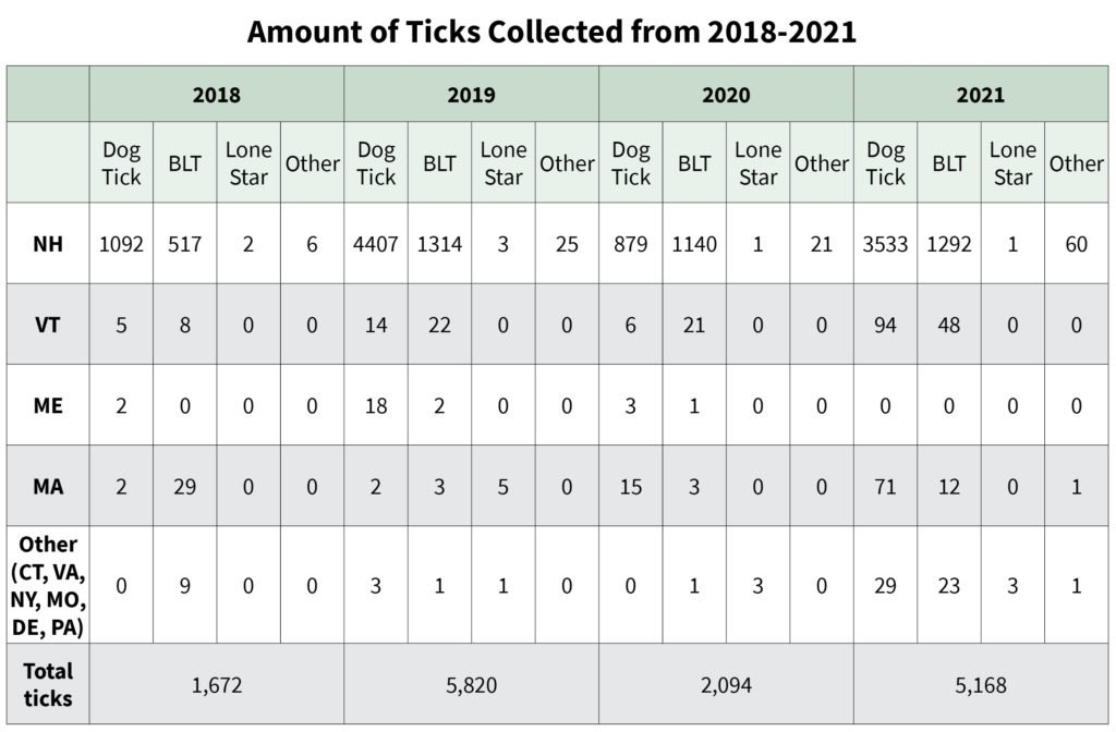 In New Hampshire, we see 50% less blacklegged (deer) ticks than dog ticks. Blacklegged ticks can carry Lyme disease. NH does have some Lone Star ticks (7 ticks collected in the past 4 years).