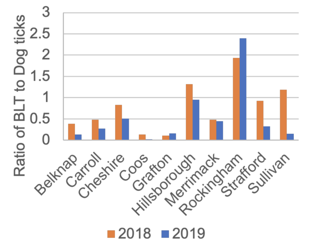 Because BeBop Labs crowdsources for ticks we normalized our data by creating a ratio of BLT to Dog ticks. We analyzed the ratios by NH county to maximize the numbers of ticks. By doing this we can see that Rockingham and Hillsborough counties have more BLT as compared to Dog ticks, ratios greater than 1. Belknap, Carroll, Coos, Grafton, Merrimack county have more Dog ticks than BLT, ratios less than 1. Cheshire, Strafford and Sullivan ticks are in between, we may need more data as the data is inconsistent from 2018 to 2019.