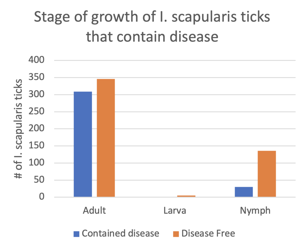 Collected nymphs were mostly disease free, with about equal amounts of adults contained disease as didn’t.