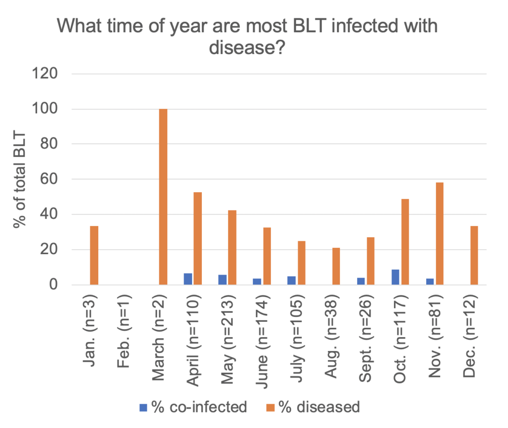 Despite having 2 seasons for disease carrying BLT, the Tick-borne diseases are steady all year round! Check out where we find disease, under out mapping ticks and disease page.